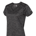 Badger Ladies Tonal Blend V-Neck Tee. 100% Sublimated polyester moisture management/antimicrobial performance fabric. Badger sport shoulder for maximum movement. Self fabric collar - Double-needle hem with tack. Badger heat seal logo on left sleeve